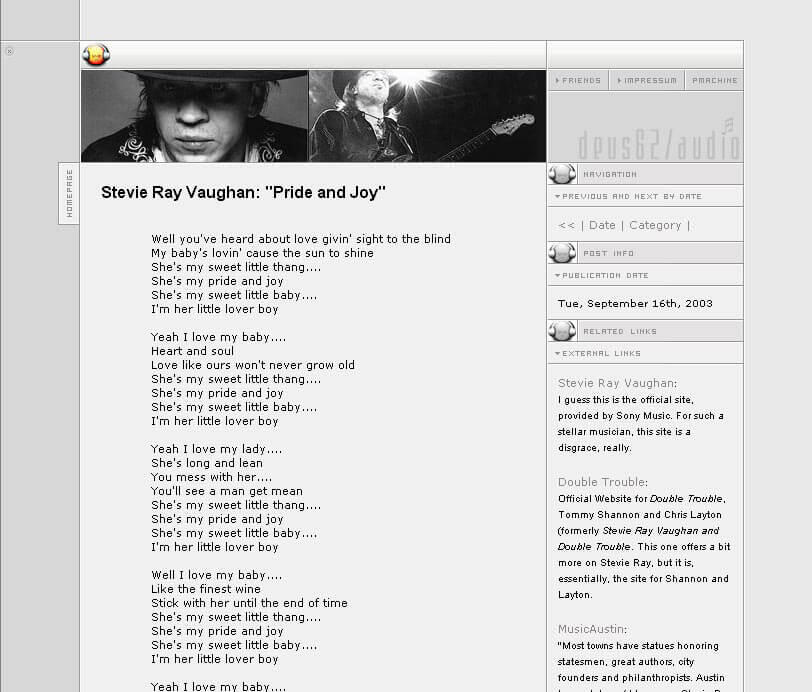 So, employing David Siegel's tricks, I designed a more structured layout in 2002 when I finally came up with and bought the deus62.com domain, which was hosted by DomainFactory (they used to be excellent and have rapidly declined since they were bought by HostEurope, which was then gobbled up by GoDaddy).