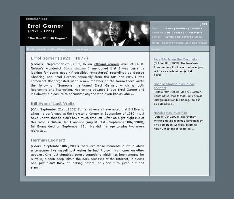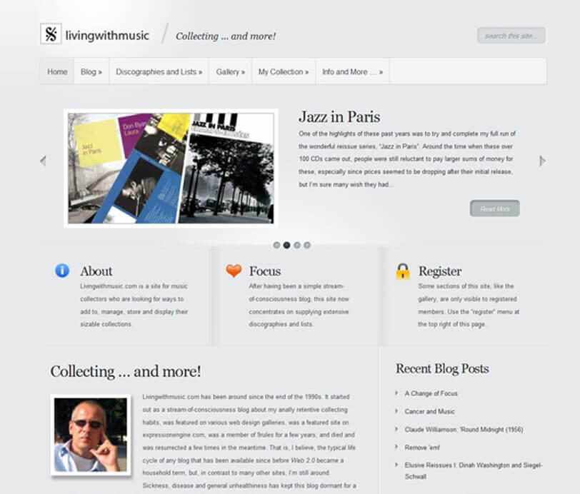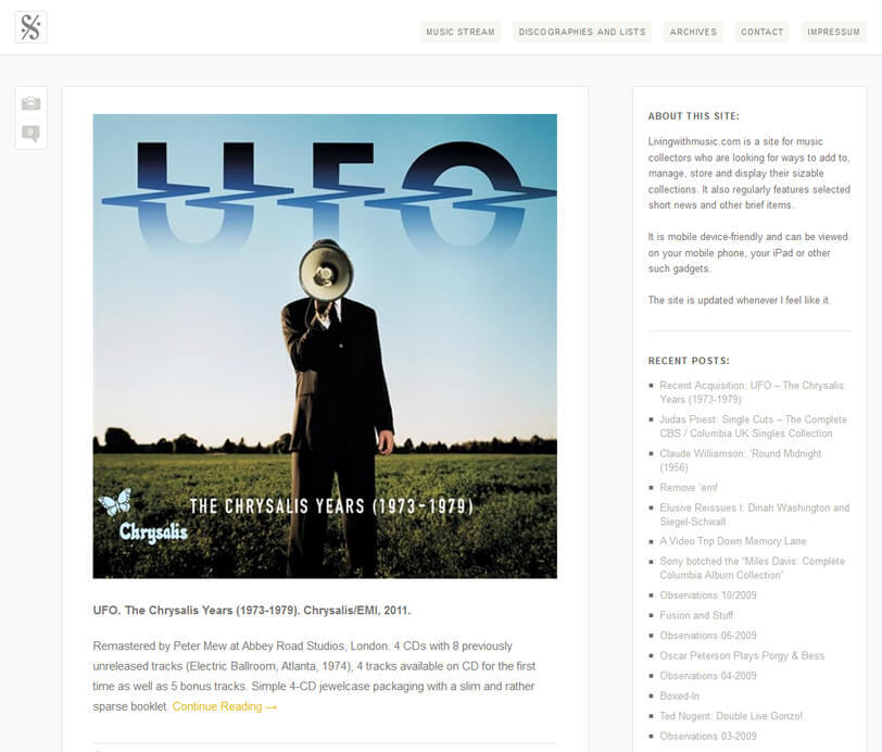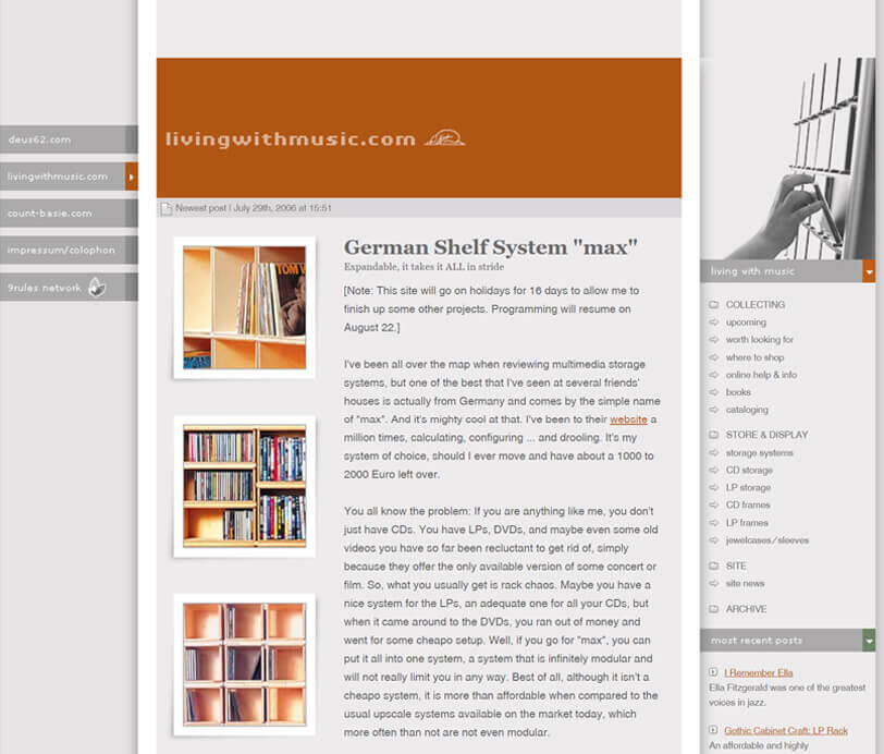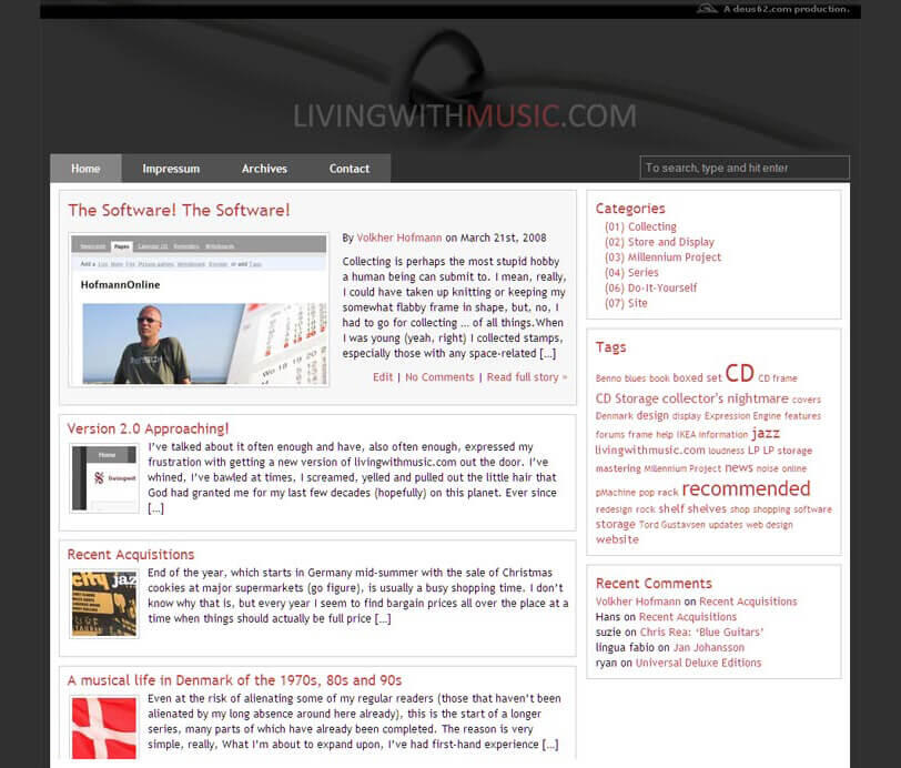 When my former hosting provider gave away really cheap lifetime hosting subscriptions for a day or two (some anniversary PR thing), I jumped on the offer and, because I had noticed that I was writing more about music on deus62.com than anything else, I started a second website to cater to people like me, music collectors with substantial collections.Livingwithmusic.com was born.Surprisingly enough, that site took off quickly, gained a substantial audience and even more exposure when it was featured (6th place) in the "Expression Engine Website Shootout". After the shootout, an interview with me was published on the ExpressionEngine website, driving even more people to my new website.