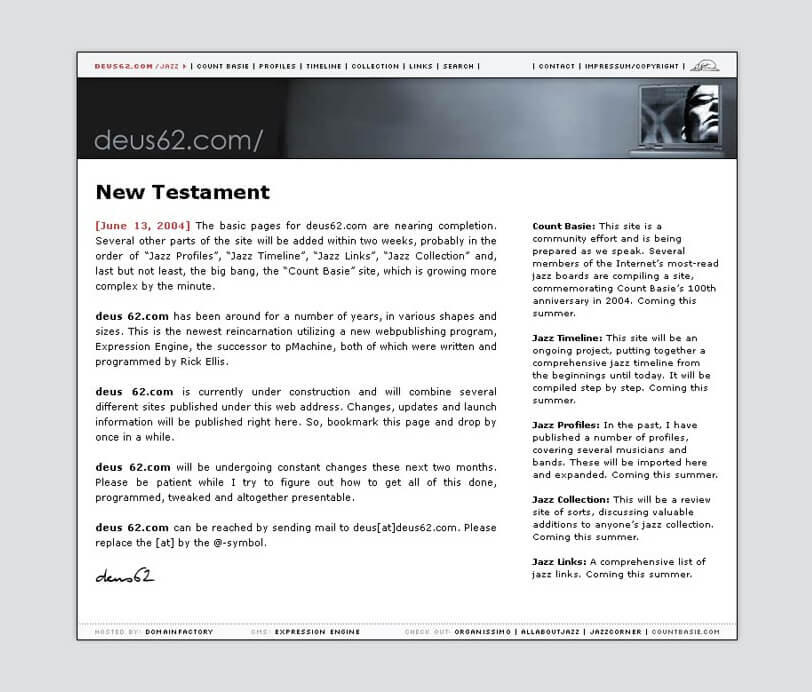 But, this reborn version of "deus62.com" has gotten much more consistent attention than any of my previous iterations. As I look back at what I have written and published here, I actually managed to keep it consistent since August 1, 2019. As of today, that's 1914 days that I can add to my publishing schedule, which extends across nearly three decades.Best of all, what I had envisioned for this site worked out splendidly. Many people use it as a contact hub and I've managed to stay in touch with people from around the globe. I've had former students of mine look me up, I've had former 9rules members get in touch, I've had former classmates of mine from my time at the "Copenhagen International School" reach out, and I've enjoyed tons of contacts that inquired about my former "Jazz in Paris", "Mosaic Discographies" and even my "Oscar Peterson" appreciation pages that were canned when I killed livingwithmusic.com.The net is not dead, it has just changed. There are still plenty of people interested in connecting outside of those destructive mosh pits that call themselves Facebook, Instagram, Twitter and whatnot.So, I'll probably be around here until I drop dead, and if I remember or have the time to plan it properly, this website might very well outlive me for a couple of years.