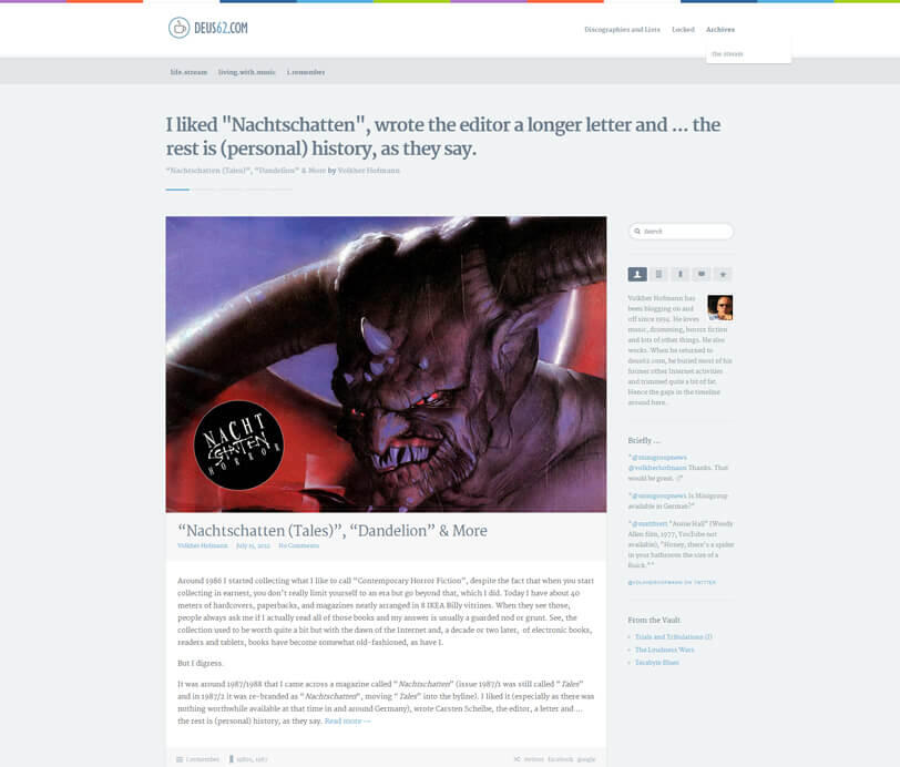 I have had websites of some sort or other online ever since the Web was invented and I had access to it. For me, (web) design and blogging fulfilled the same function as first-person shooters did for other people. It might be an odd comparison, but instead of throwing virtual mines at groups of slimy aliens and enjoying the mayhem, I got a kick out of designing posters, CD covers, flyers and web pages for myself (and sometimes for others), especially to relieve the stress I regularly encountered in my day job.It was a hobby and has remained one until today.I have also always enjoyed writing, for myself and for others, and that's why I have had many different sites, redesigns and projects online until today. I never really cared if anyone read what I had to say, but at some point I noticed that lots of people did and, in the heyday of blogging, not a day went by with lots of comments that needed to be moderated.Two of those websites became mainstays of my online life for decades, deus62.com and, for a longer while, livingwithmusic.com, although I also had a Tumblr blog online at some point and regularly participated on Facebook, Instagram, Twitter and Reddit for quite some time.