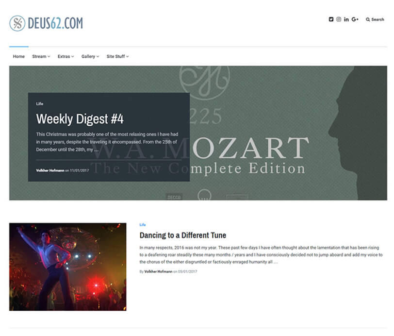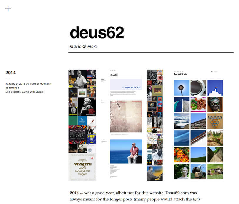 Intermittently, my site would fall silent until I picked it up again, simply because I felt like playing around with it and occupying my mind with other things. At some point, I started posting longer "summary" posts, like "This Month in Music" or "Weekly Digest" , but my posting schedule had shrivelled down to one post every couple of weeks.At some point, updating the complex publishing backend, the various themes, plugins and whatnot became more than cumbersome and I began to hate WordPress for being too sluggish, a spam magnet and riddled with (especially plugin) security updates that rolled in all too often.In regard to blogging, I didn't think there was really a point to it anymore. Social networking sites had become totally prominent and online culture had changed fundamentally.So, in 2017, I first put all my various sites and activities into permanent limbo and then I deleted all of them, across websites and social network profiles.Below then is a screenshot of the final reincarnation of my old sites, all rolled into one: the final deus62.com run on a self-hosted WordPress backend.