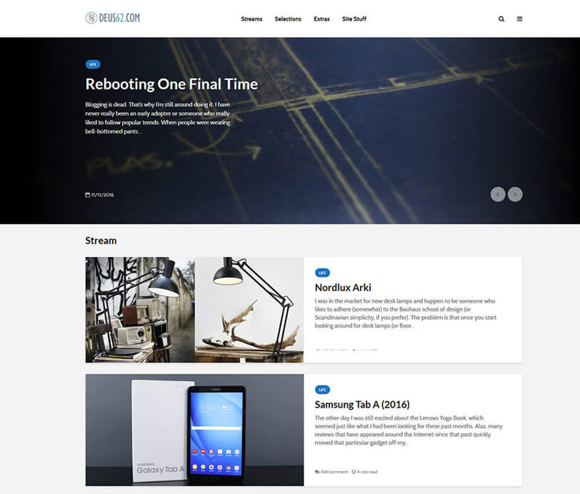 On the revived deus62.com domain, I kept blogging and redesigning, enjoying the work with various excellent themes the always reliable elmastudio.de and Mike McAllister came up with.But, real life often got in the way and health problems started to multiply for a couple of years. So, like most other people, for some years I spent more time on social networks (especially first Facebook and then Instagram) and conversing with friends and acquaintances there. The blogging gradually moved into the background and became more infrequent, but never stopped.