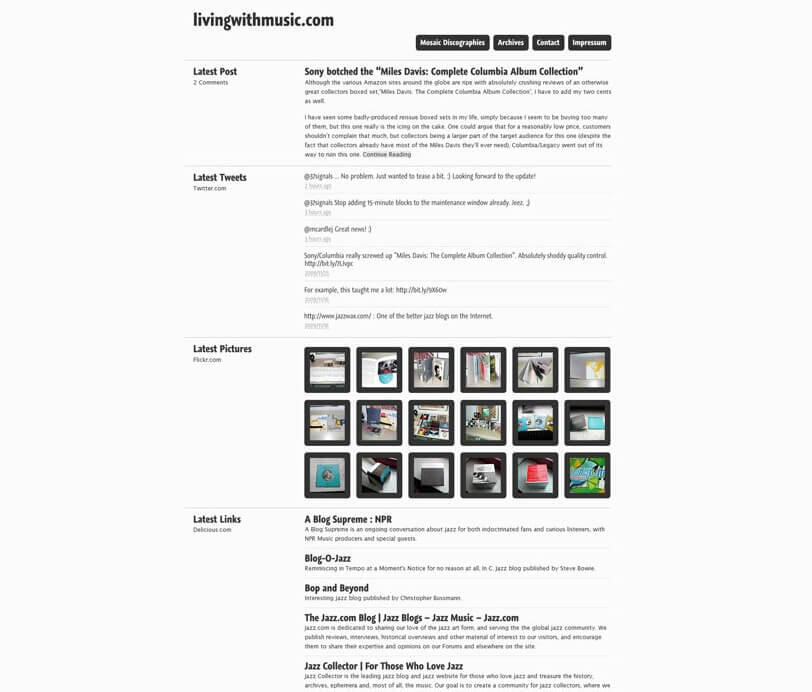 This move coincided with my switch to WordPress.Expression Engine had become a little too complicated for me and some health problems were beginning to limit the time I could devote to my websites. WordPress was simply more efficient for my purposes and allowed me to keep hanging on.The first WordPress version of livingwithmusic.com was a minimal and elegant theme-based redesign, one which existed for the time I needed to learn how WordPress worked.